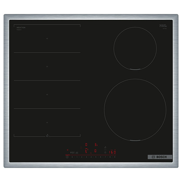 Bosch indukcijska kuhalna plošča s štirimi kuhališči in FlexInduction prilagodljivo cono. Tehnologija indukcije segreva zgolj dno posode, ne pa celotno ploščo. S tem zagotavlja varnejšo, varčnejšo in učinkovitejšo uporabo. FlexInduction omogoča združitev dveh kuhališč v eno, pri čemer plošča samodejno zazna velikost in položaj posode za natančno in učinkovito segrevanje. Na 40 cm dolgem območju lahko uporabljate posode poljubnih velikosti in oblik ter izbirate med sedemnajstimi stopnjami moči. Napredno ploščo lahko tudi povežete z aplikacijo Home Connect, v kateri lahko izvedete oddaljeno diagnozo težav, nastavite priljubljene načine ali si ogledate okusne recepte. Ima nizek okvir iz nerjavečega jekla, ki je kot nalašč za vgradnjo v obstoječe izreze v pultih.